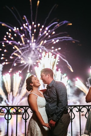 Find a way to say hello to your wedding guests and bring everyone together before the big day—whether that’s a causal meet up or a formal event! Brooke and Jared chose to host their welcome party at EPCOT, which would be the backdrop for all their wedding events. They continued the galactic theme with navy sequined linen and celestial inspired centerpieces. They even incorporated the theme into their wedding menu—like their space themed cocktail which was served in a cosmos Corkcicle (also a fun favor for their guests)! Brooke and Jared were able to mix and mingle with their loved ones and then enjoy a magical viewing of Harmonious together.