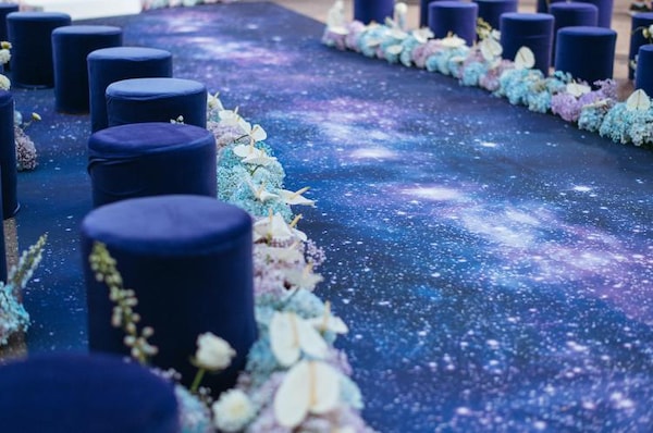 Transport your guests and engage their senses to create an unforgettable wedding experience. Start with your venue—Brooke and Jared chose Spaceship Earth as the setting for their ceremony, this iconic celestial environment was a perfect match for their wedding theme. Their décor found inspiration from the night sky with soft velvet ottomans, a dancing star-studded aisle runner, floral dyed to match the galactic color scheme, fog effects, live music and an epic sparkler moment—all contributed to creating an environment that helped guests stay present and immersed in the moment.