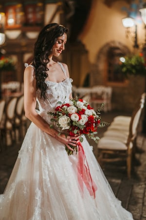 - Include a pop of color with red roses or a red ribbon in your bouquet