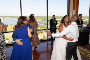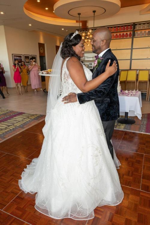 Their wedding reception was full of love, laughter, and dancing. Mickey and Minnie Mouse even made an appearance to help the couple cut their cake and take pictures outside on the terrace with Cinderella’s Castle in the background.
