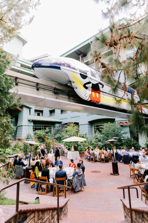 Along with all things Disney, Phinn and Andres enjoy hiking and traveling, sharing that they love “visiting countries across the globe and exploring national parks in our own backyard.” So, the Disney Weddings team transformed Brisa Courtyard into a garden of pine and greenery to honor their love for the outdoors. The couple expressed that “having our wedding… surrounded by redwood trees and the architectural beauty of the Arts & Crafts movement all while the Disney monorail travels by it felt like having a destination wedding right here at home.”