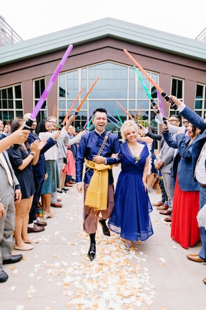 As Andres walked down the aisle, all their wedding guests took out lightsabers to ignite his way.