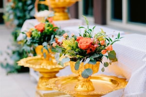 As part of the ceremony décor, the venue was adorned with greenery and flowers in shades of orange, yellow, and pink. The couple also incorporated a floral petal toss at the end of their ceremony.
