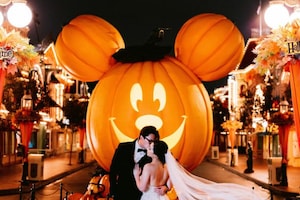 Couples who host their Disney Wedding with us have the opportunity to book park portrait sessions where they can have photos taken in their wedding attire at spooky spots like The Haunted Mansion at Disneyland Resort and the Walt Disney World Resort, The Hollywood Tower Hotel, or in front of the iconic Mickey pumpkin in Disneyland!