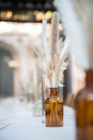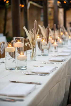 Hosting a pre-ceremony dinner, though non-traditional, allowed Adam and Andrew the opportunity to begin the day in celebration—greeting their guests and reminiscing on their love story with friends and family. The setting was picturesque with white string lights, floating candles, and bouquets of pampas grass.
