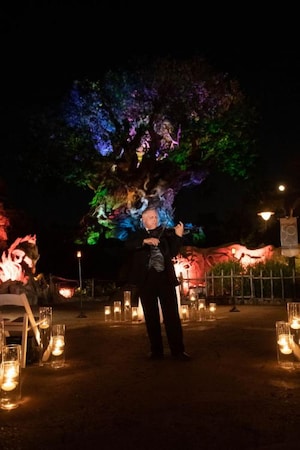 And their wedding ceremony was just that – with an immersive ambiance created by custom lighting on the trees and floating candles lining the aisle. As a surprise and delight for their guests, Adam and Andrew ended their wedding ceremony with an experience only possible in the Disney Parks, a special lighting projection displayed on the Tree of Life.