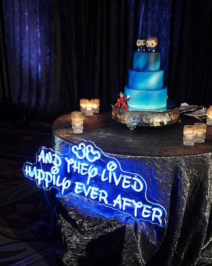 The couple continued to celebrate all throughout the evening during their Fantasmic! inspired reception. Gorgeous uplighting mimicked starlight against the velvety, dark drapes.